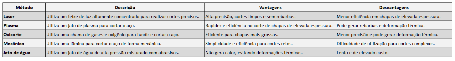 No processamento de chapas de aço, o mercado possui métodos de corte já conhecidos, como: laser, plasma, oxicorte e mecânico. O corte com jato de água de alta pressão misturada com abrasivos também pode ser eventualmente empregado. AWJ – Abrasive Water Jet.