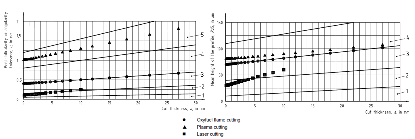 Os gráficos abaixo retirados da EN ISO 9013 (Thermal Cutting: Classification of Thermal Cuts – Geometrical Product specification and quality tolerances) representam o posicionamento dos ranges de qualidade, bem como os valores esperados para cada tipo de método de corte. Percebe-se que o corte à laser apresenta as menores tolerâncias (perpendicularidade e rugosidade) entre os três métodos citados.