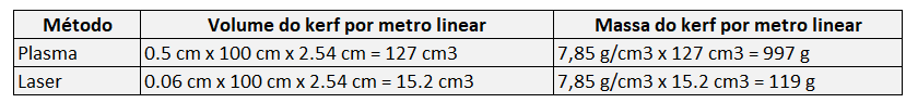 Perdas de corte (kerf) típicas em chapa de aço 12,5mm