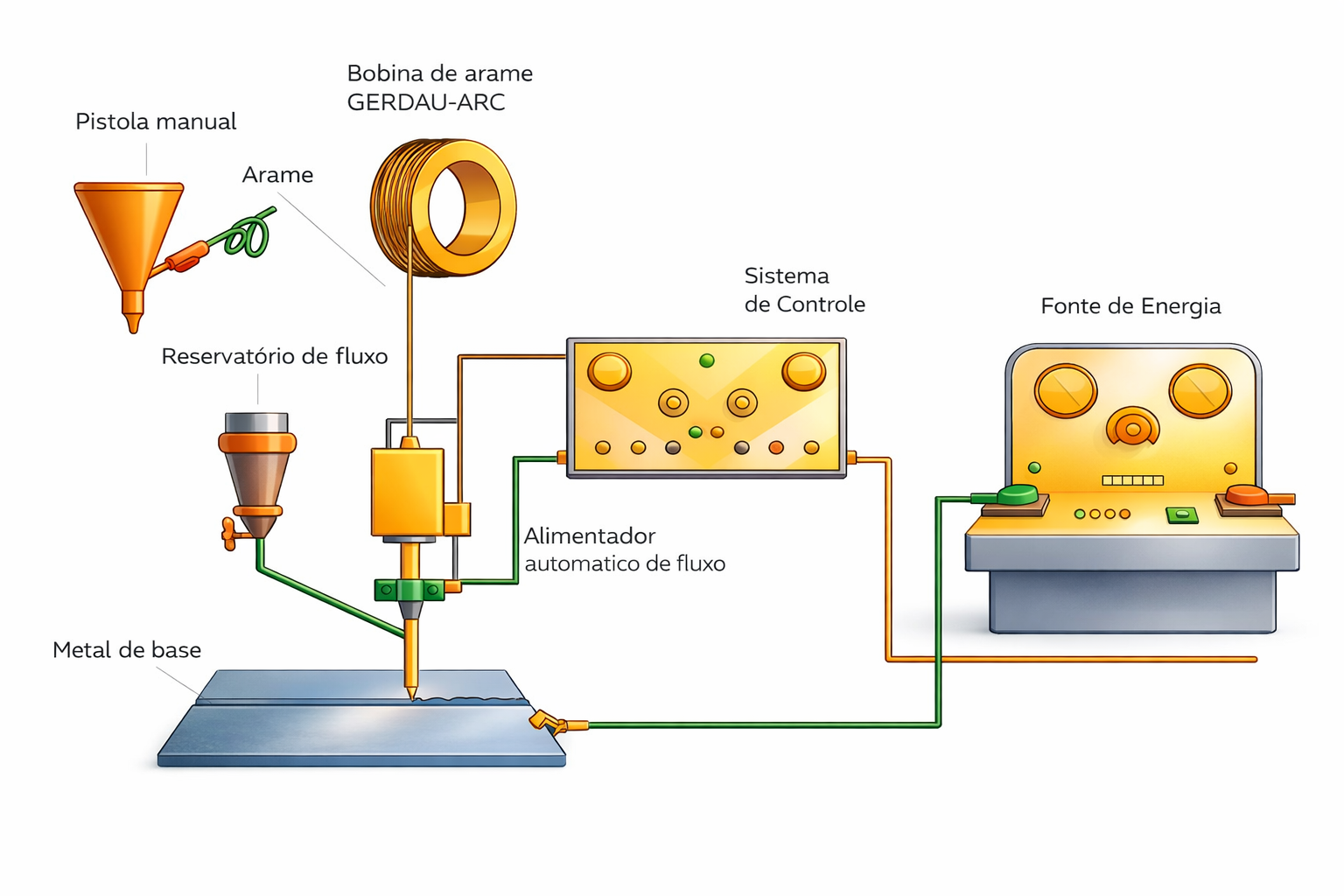 Além disso, esse fluxo atua como isolante térmico, reduzindo perdas de calor e aumentando a penetração. Esse processo é normalmente automatizado ou semi-automatizado, sendo ideal para soldas longas e repetitivas.